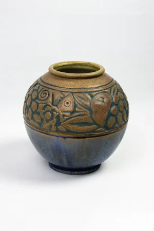 Cette pièce de forme “boule” associe la rigueur décorative de l’Art déco nancéien à une très belle mise de matière. La partie haute porte un décor en frise profondément incisé et réservé dans la pâte : fleurs rayonnantes, grappes, oiseau et poisson alternent avec des feuilles et spirales pour composer une bande continue. Le registre inférieur, séparé par un léger congé, présente un émaillage bleu nuancé aux irisations cristallines, typique des recherches de la maison Mougin sur les grès décorés. L’intérieur est couvert d’un émail vert olive.