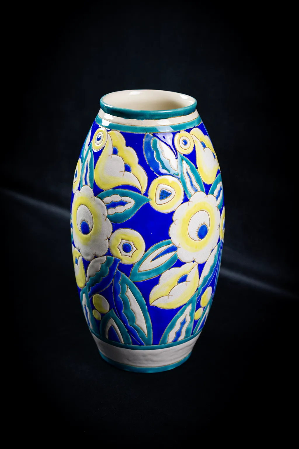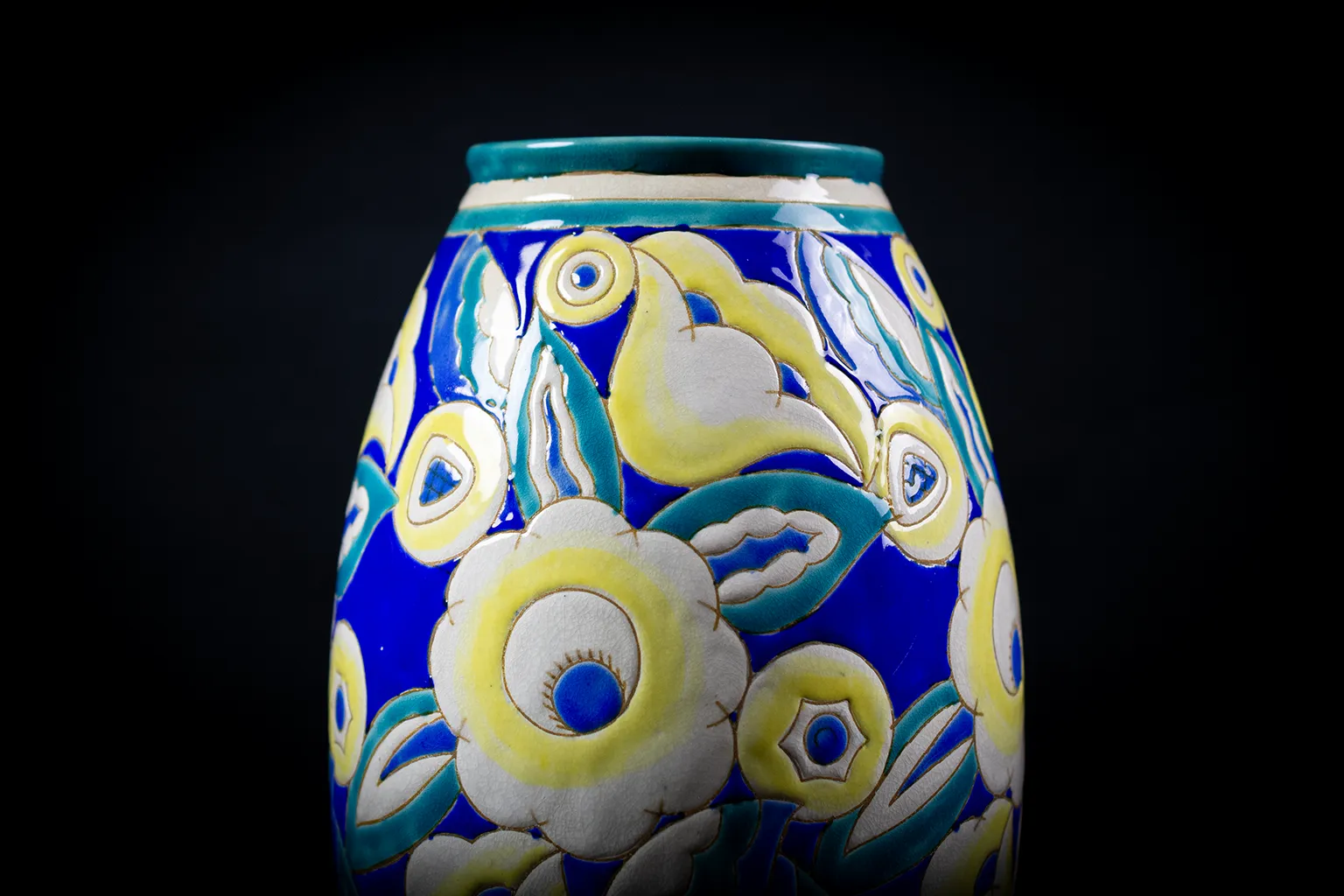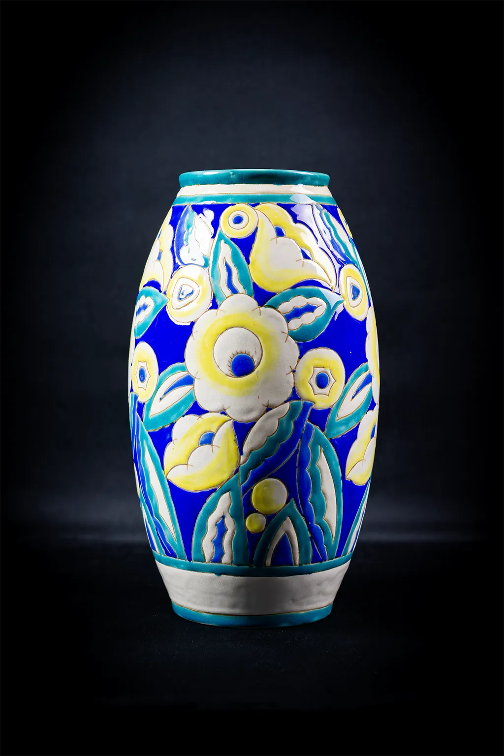 Ce vase tonnelet en faïence émaillée, produit par la manufacture Kéramis dans les années 1930, incarne l’élan décoratif et industriel propre à l’Art Déco belge. La forme équilibrée, légèrement galbée, sert d’écrin à un décor en léger relief composé de fleurs stylisées aux pétales ronds et feuillages en arabesque, traités dans une gamme chromatique audacieuse : bleu cobalt, jaune souffre, vert turquoise et blanc cassé.