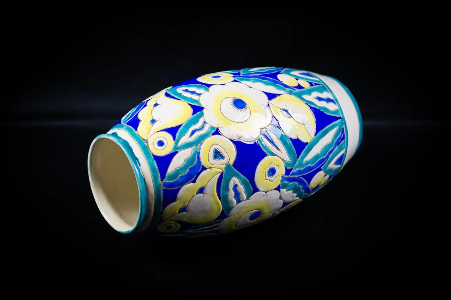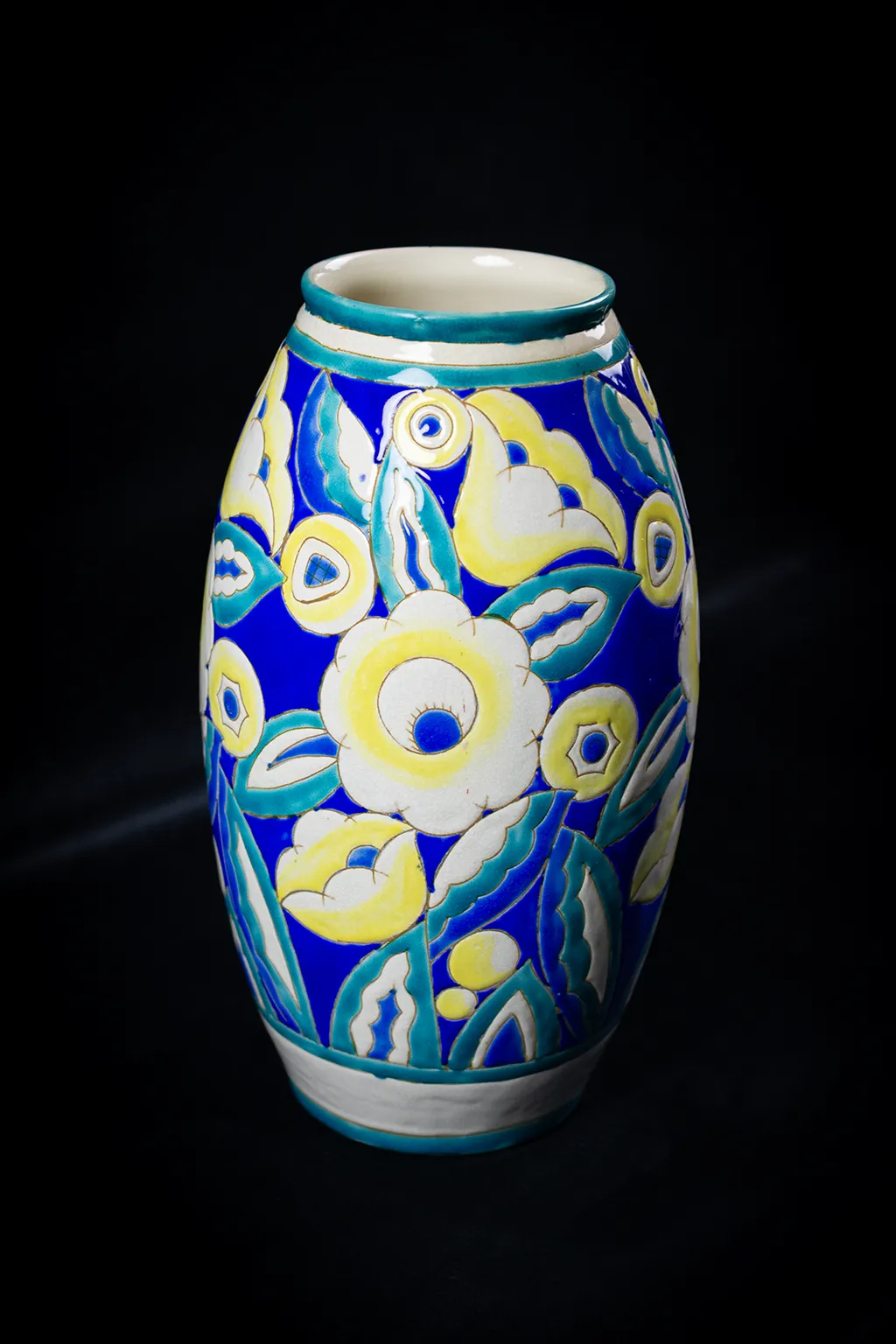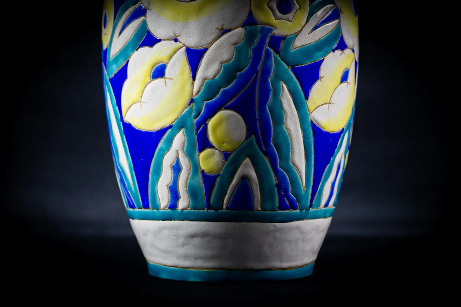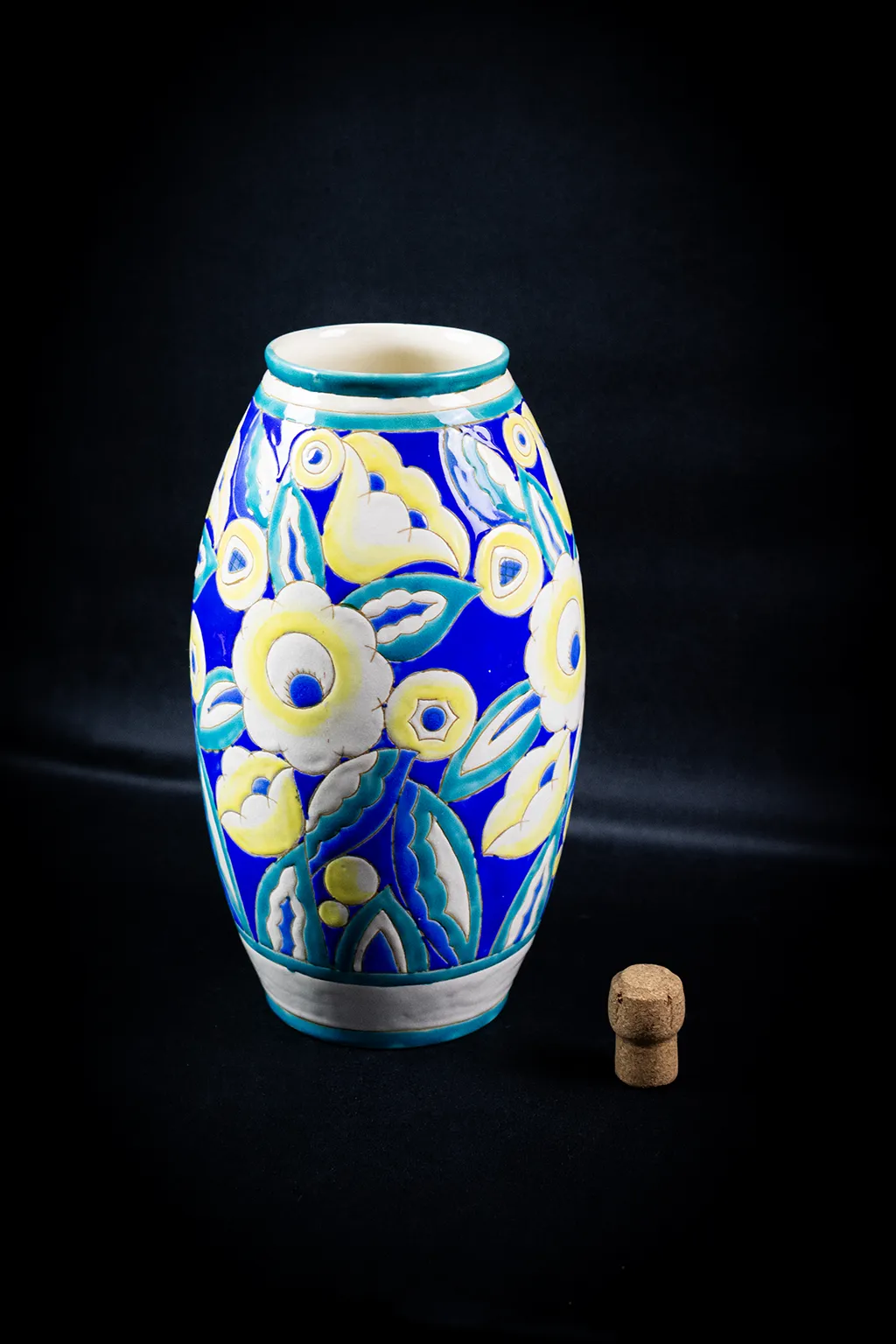 Ce vase tonnelet en faïence émaillée, produit par la manufacture Kéramis dans les années 1930, incarne l’élan décoratif et industriel propre à l’Art Déco belge. La forme équilibrée, légèrement galbée, sert d’écrin à un décor en léger relief composé de fleurs stylisées aux pétales ronds et feuillages en arabesque, traités dans une gamme chromatique audacieuse : bleu cobalt, jaune souffre, vert turquoise et blanc cassé.