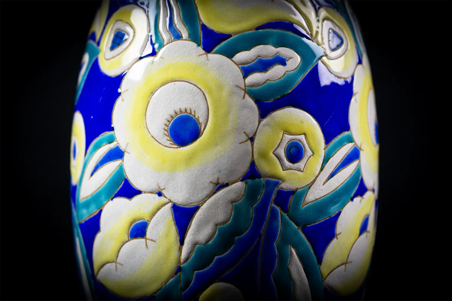 L’émail épais, posé en aplats vifs, évoque le langage formel développé sous l’influence de Charles Catteau, directeur artistique de Boch Frères Kéramis à La Louvière. Si la pièce ne porte pas la signature de Catteau, elle s’inscrit néanmoins dans la dynamique de son atelier de décoration, où ses élèves appliquaient un vocabulaire formel reconnaissable à ses contours nets et à sa stylisation géométrisante de la nature.