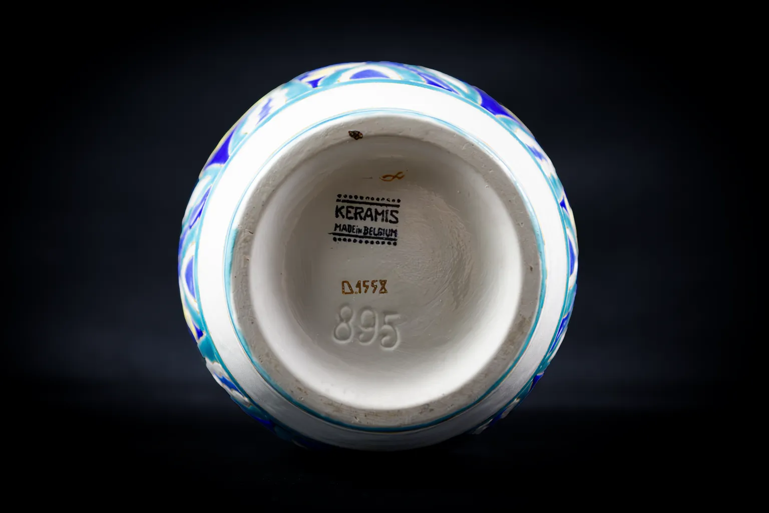 La base du vase est marquée du tampon imprimé KÉRAMIS – Made in Belgium, accompagné des numéros de décor (D.1558) et de forme (895), caractéristiques des productions de série artistique de la maison. L’intérieur est laissé crème, contrastant avec l’éclat du décor extérieur. La glaçure présente un craquelé subtil, témoin du procédé de cuisson et de l’ancienneté de la pièce, sans fragilité structurelle.