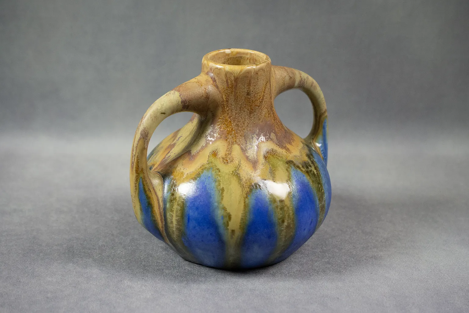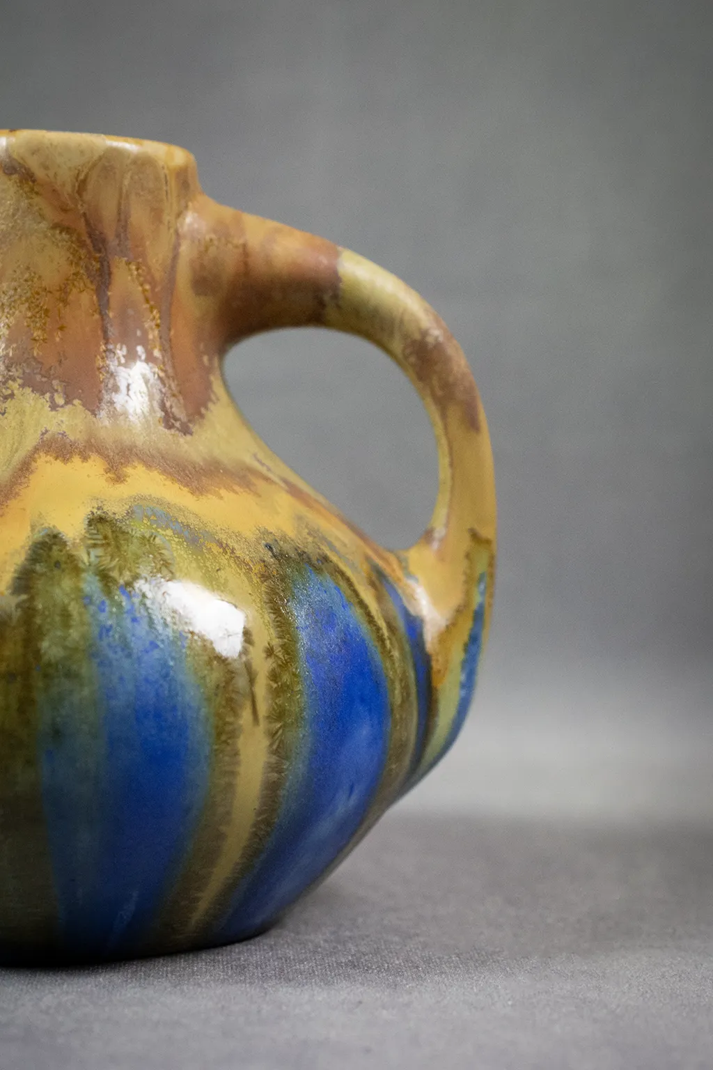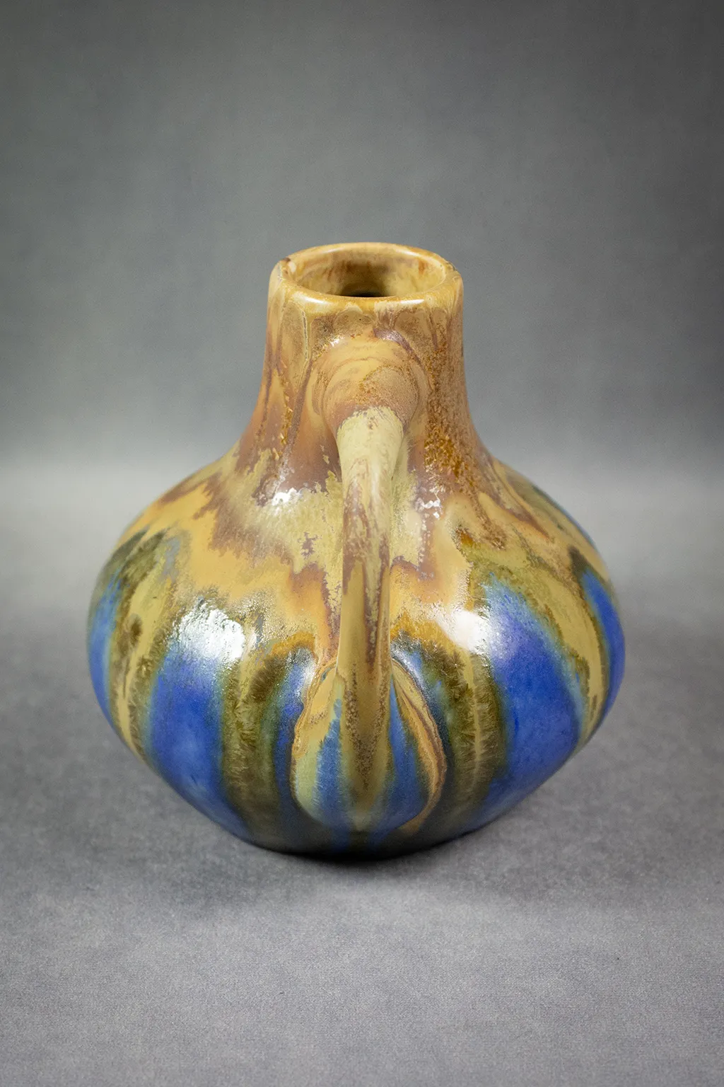Le décor de coulures verticales — allant de l’ocre fauve au bleu cobalt, en passant par des nuances olive et vert mousse — révèle la maîtrise des superpositions d’émaux fluides, dans la tradition des recherches menées sur les glaçures de grès à haute température. L’effet obtenu, à la fois organique et maîtrisé, joue sur les contrastes mats et brillants, les transitions franches et les zones floutées par la fusion.