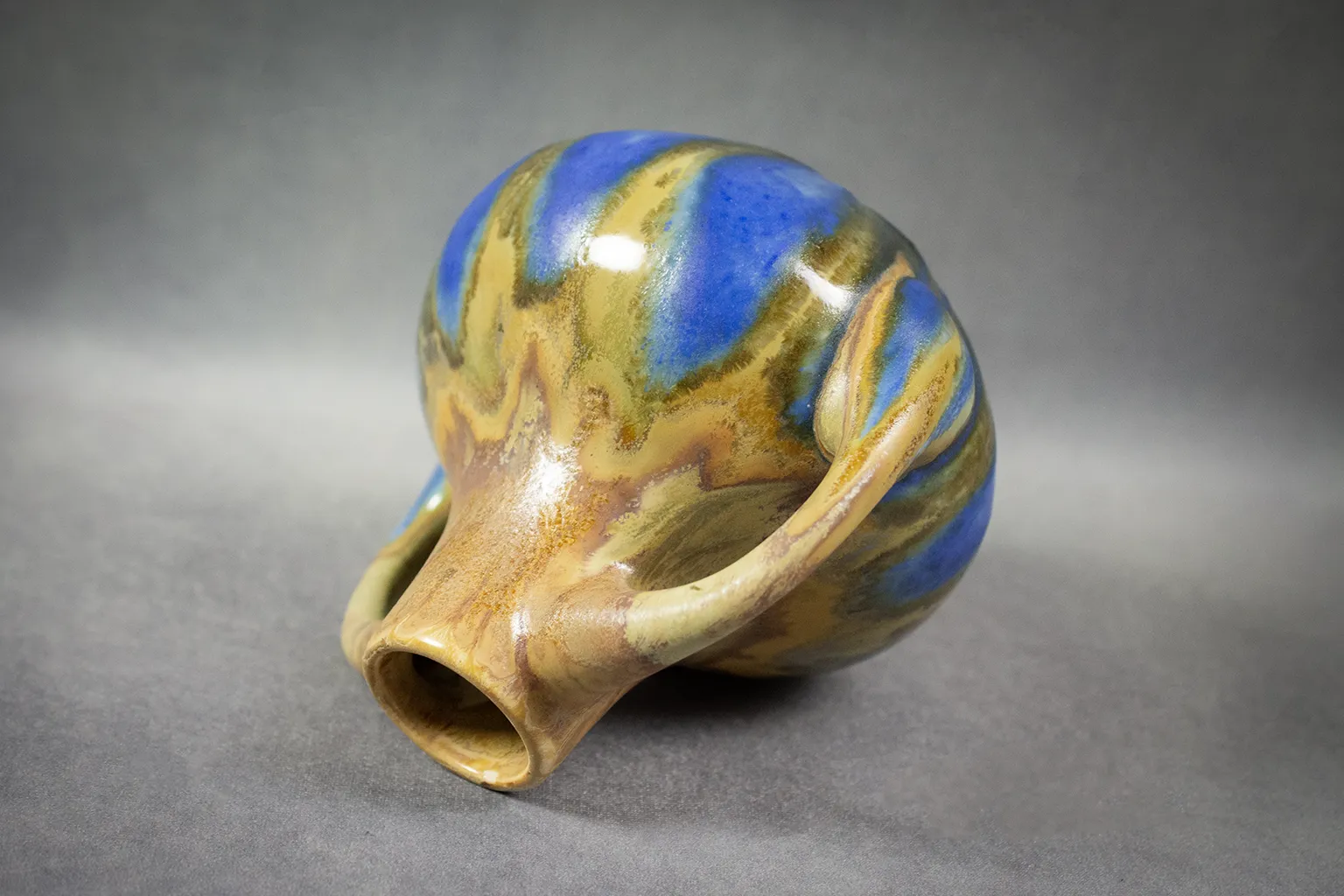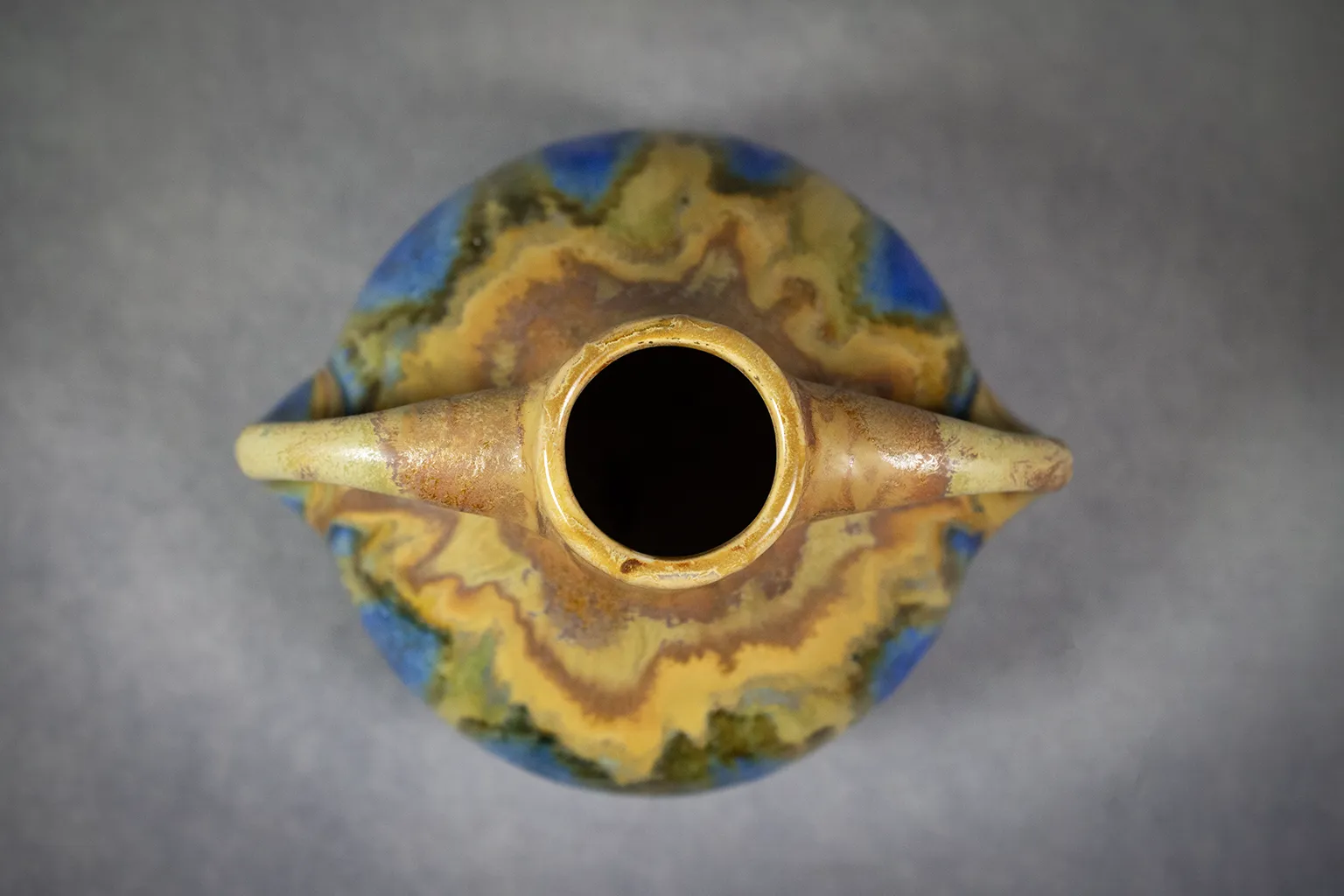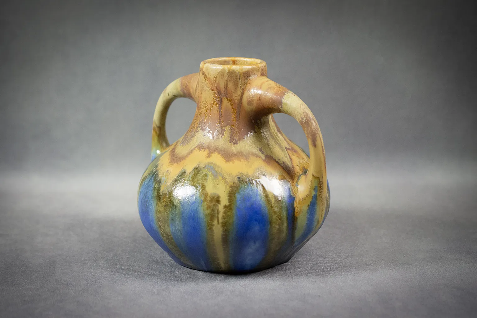 Le décor de coulures verticales — allant de l’ocre fauve au bleu cobalt, en passant par des nuances olive et vert mousse — révèle la maîtrise des superpositions d’émaux fluides, dans la tradition des recherches menées sur les glaçures de grès à haute température. L’effet obtenu, à la fois organique et maîtrisé, joue sur les contrastes mats et brillants, les transitions franches et les zones floutées par la fusion.