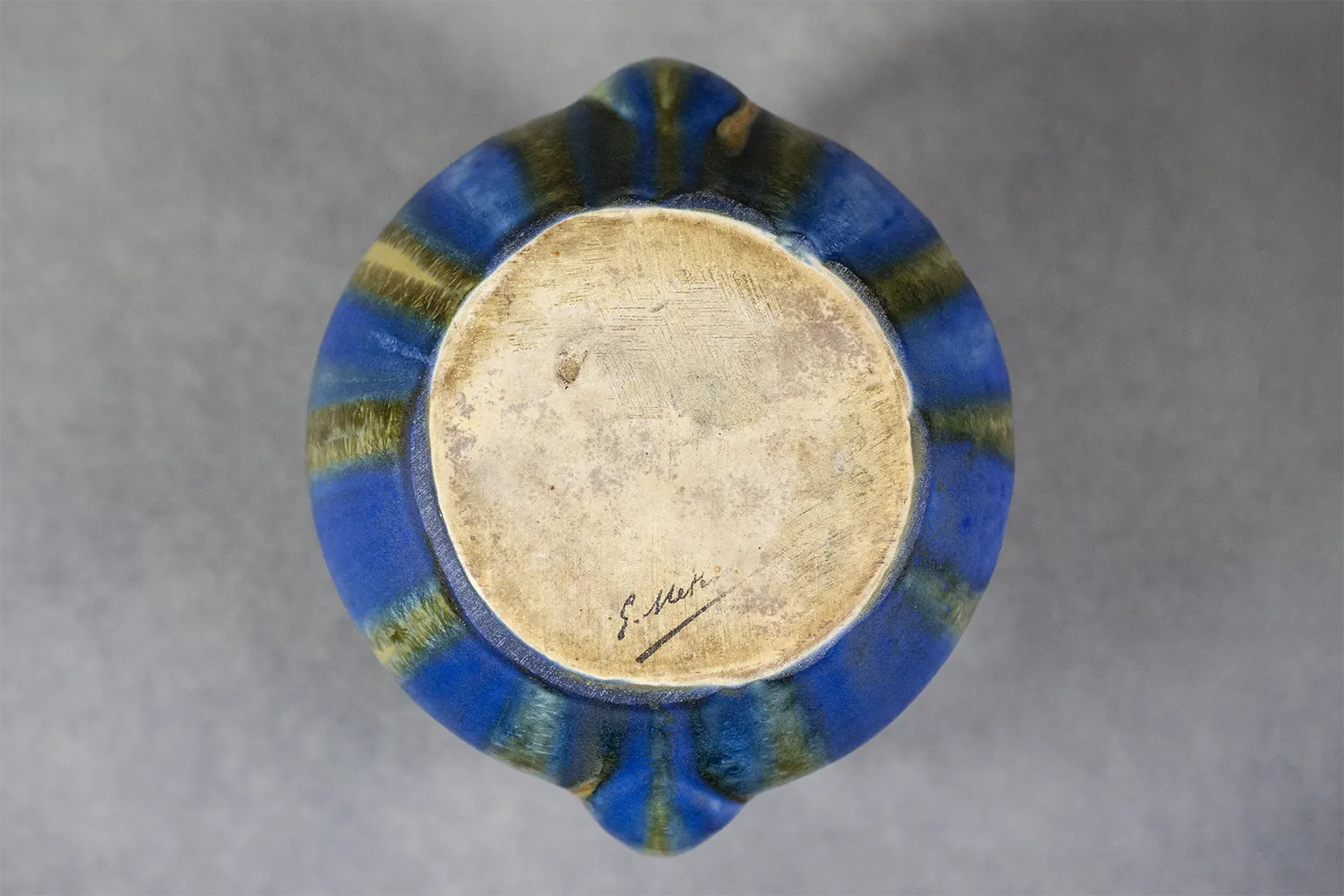 La signature de Méténier, située sous la base, vient confirmer l’attribution à cet éminent céramiste établi à Gannat, dont l’atelier fut actif dès les années 1910. Ce vase incarne à merveille le style décoratif qu’il développa : des formes sobres, mises en valeur par un travail sophistiqué des émaux.
