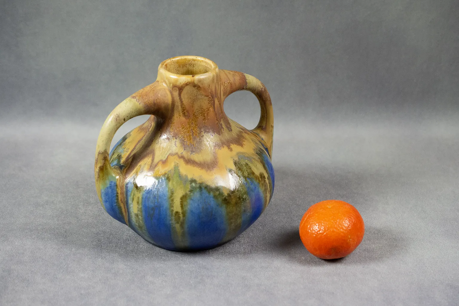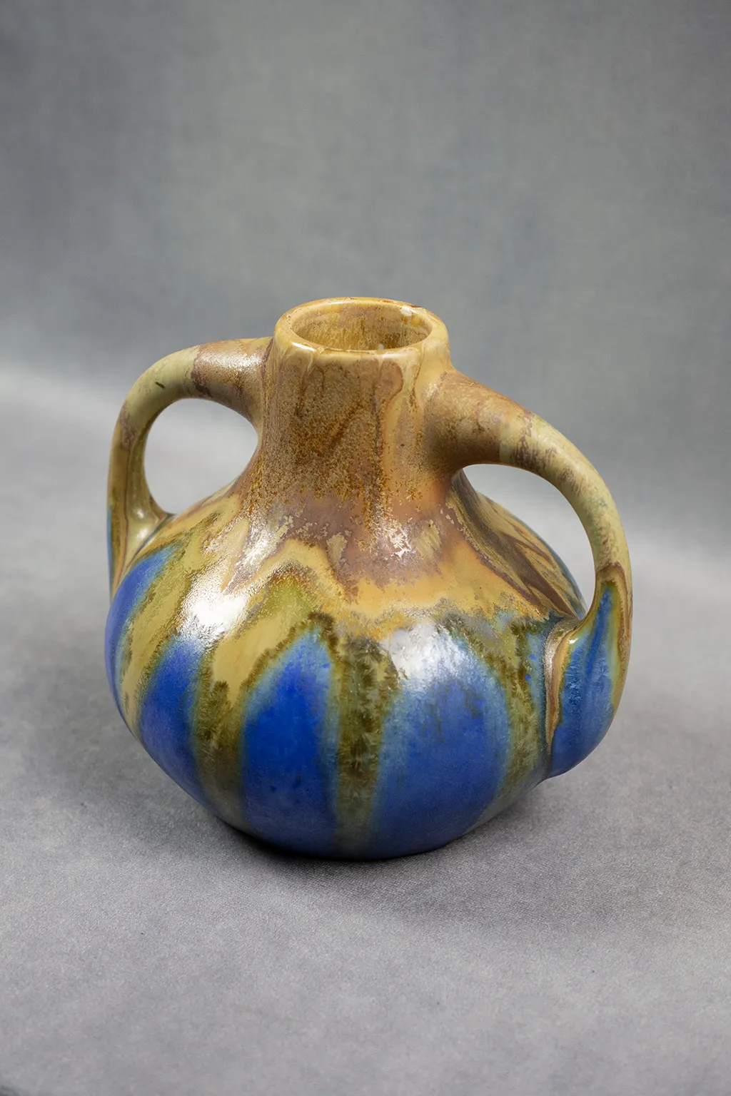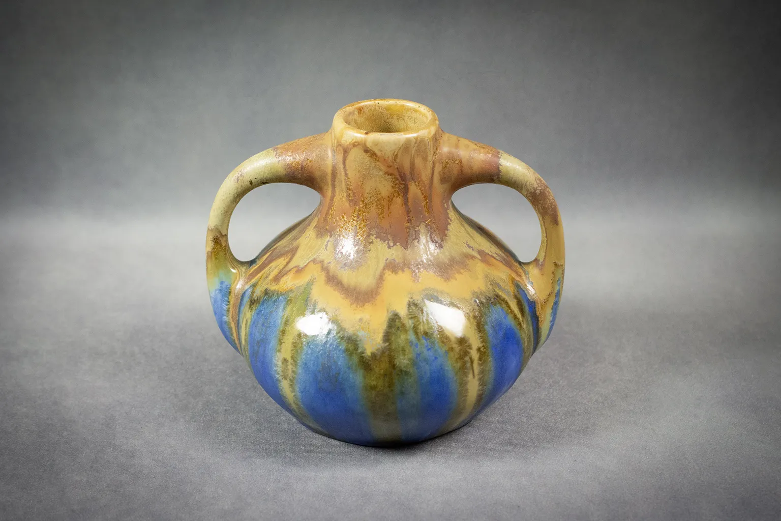 Vase pansu en grès émaillé à deux anses signé Gilbert Méténier, avec décor de coulures fauves et bleues. Un témoin raffiné de l’Art céramique français du début XXème.